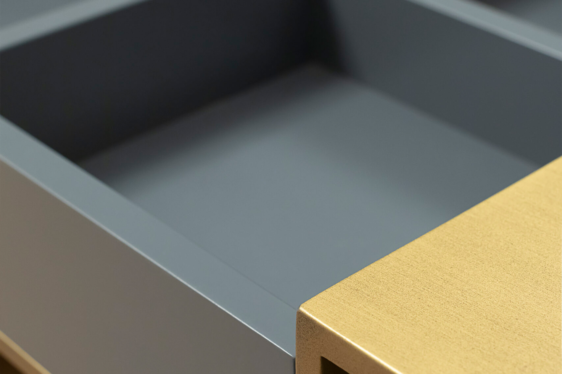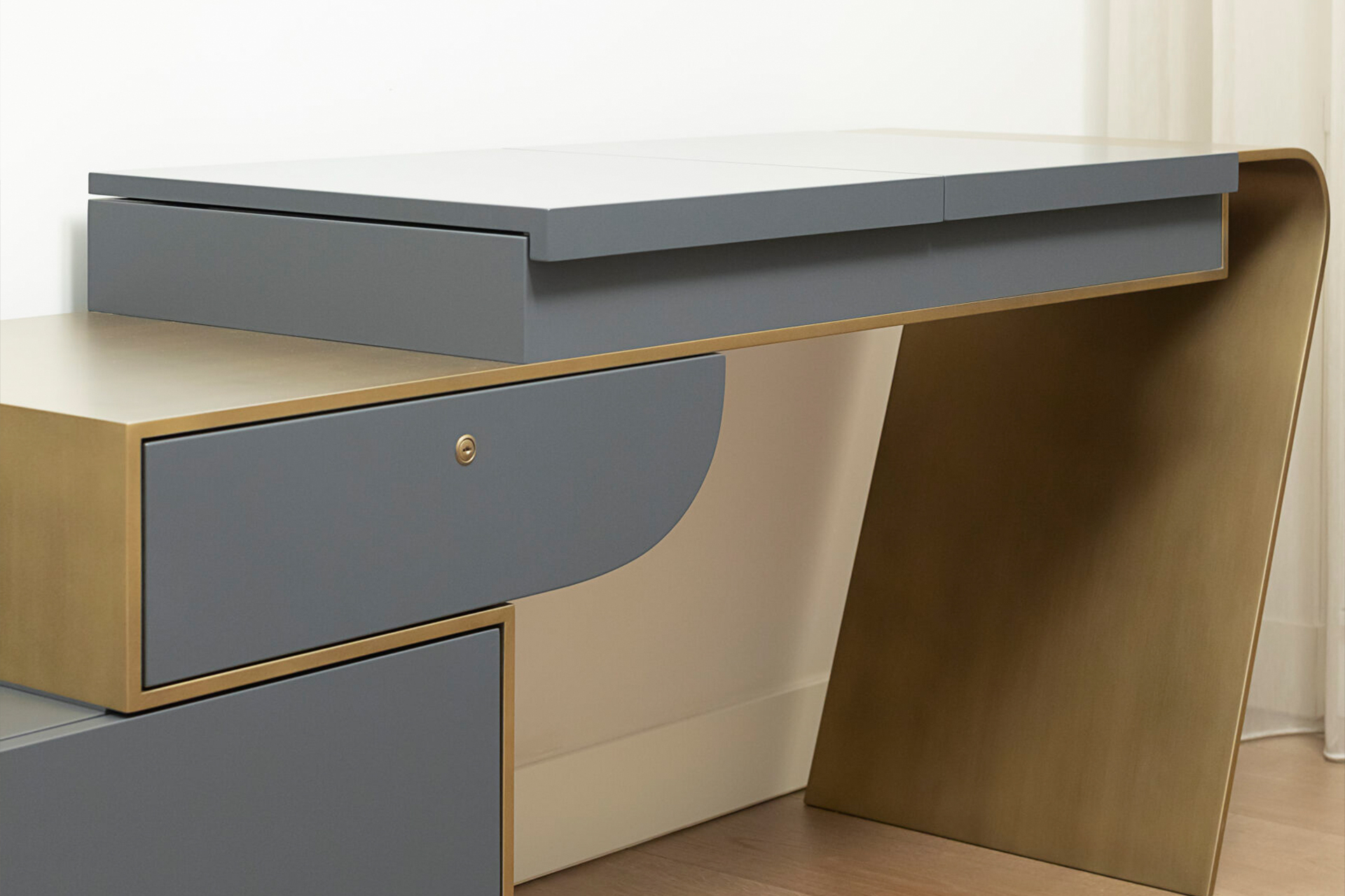 La gamba esile ed elegante sostiene il corpo funzionale di questo mobile, pannelli apribili che contengono spazio organizzato per il trucco o per accessori personali oltre specchi. Il modulo laterale completa il contenimento ma può funzionare da comoda panca per una master bad o per una comoda zona toilette.